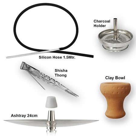 - يُرفق معها خرطوم (النبريج/ اللي) بطول 1.5 متر مصنوع من السيليكون حيث يتم وصله بالمبسم ووصله بجسم الشيشة من خلال وصلة الخرطوم.